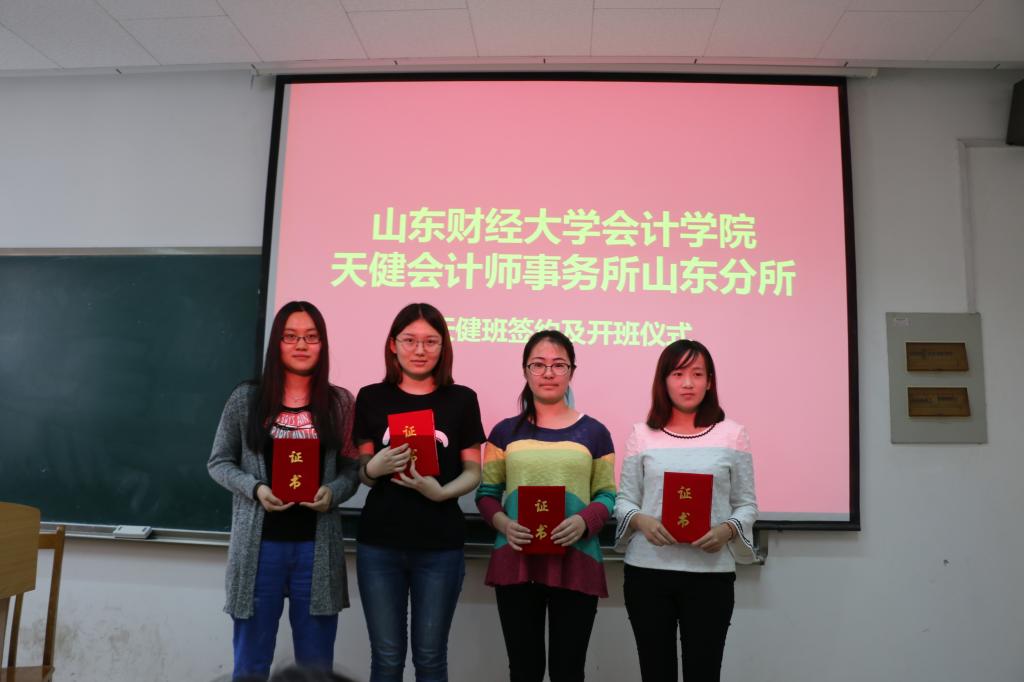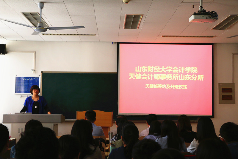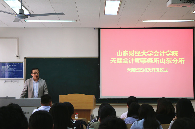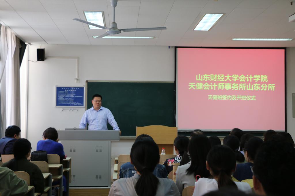 5月4日,太阳成集团tyc151cc天健会计师事务所山东分所天健班签约及开班仪式在燕山校区逸夫楼108教室隆重举行。天健会计师事务所高级合伙人、山东分所总经理刘加宝,副总经理韩炳海,太阳成集团tyc151cc党委书记张涛、副院长孙文刚等出席了本次仪式,入选天健班的40位同学共同参加。