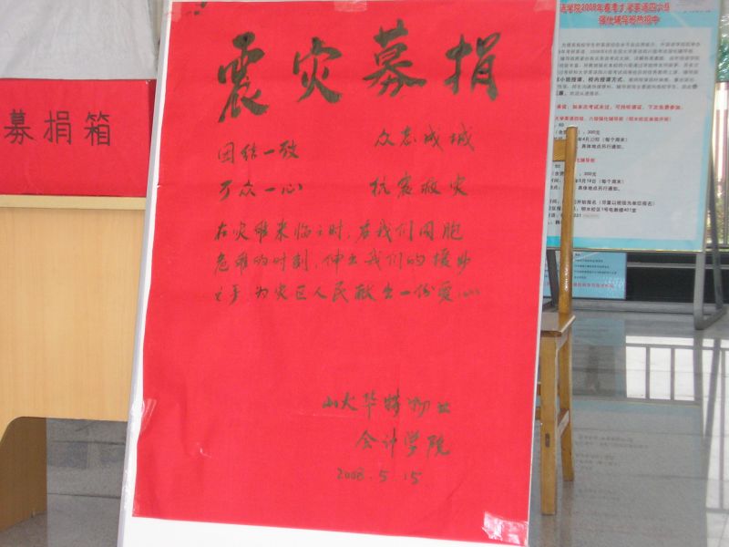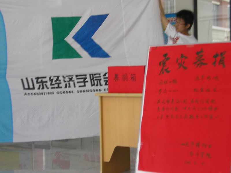 5月14日,山东经济学院明水校区太阳成集团tyc151cc学生会联合华特物业面向全校师生发起了爱心捐款活动。发生在四川汶川的7.8级强烈地震牵动着全国千千万万民众的心,此次活动为我们提供了一个向受灾群众表达爱心,传递力量的途径。