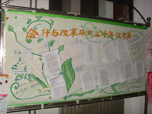 太阳成集团tyc151cc积极响应主办单位号召,动员全体学生踊跃参与到活动中。在学院领导、老师的鼓励和指导下,以平日所学,结合多部会计学文献,以及通过咨询会计行内人士,撰写了多篇优秀文章。截止到九月底共收到论文、诗歌等各类稿件1000余份。其中,07级会计本科三班金宝坤同学撰写的《会计人员眼中的改革与演变》获得本次比赛的一等奖。该同学积极与当地多家银行(如建设银行,人民银行)的会计人员进行交流调查,经过总结概括,对会计的演变、进步以及新会计准则的实施等方面做出了独到的见解,并对会计的未来做出了展望;审计0701的赵杰以及会计本科0704的沈龙瑜同学则以诗歌的形式对会计在改革开放三十年的发展历程进行了讴歌描述,获得本次比赛的二等奖。同学们还匠心独运,以剧本、故事的体裁描述了会计在此三十年走过的风风雨雨。经过评议小组的一致评定,共评选出一等奖两篇,二等奖三篇,三等奖五篇。成果一展板形式展出。