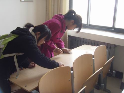 来自12个学院的160多名志愿者自带抹布、橡皮、小刀等工具齐聚教学楼,开始了他们的清洁工作。每10人为一个小组,负责相对的一个中型教室和一个小教室,其中中型教室由于平日课程多,“课桌文化”现象比较严重,为清洁重点。大家先用抹布整体擦过一遍,接着用橡皮和小刀对课桌上的字迹和污垢进行具体清理,再配合使用抹布将纸屑和橡皮末收拾干净。其中圆珠笔和记号笔的字迹尤为顽固,费了志愿者们不少力气。最终,大部分课桌都恢复了他们本来的面目,让在场的所有人都感到十分欣慰。