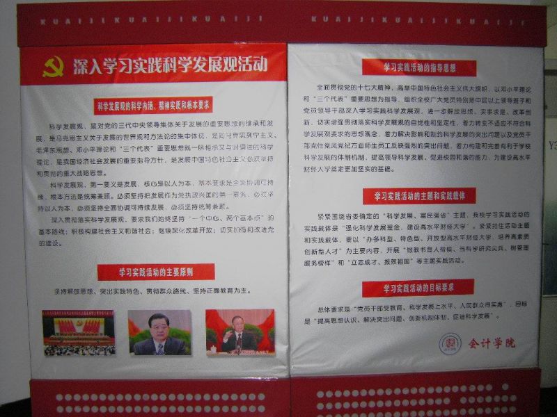 认真挖掘、总结学习实践活动中的亮点、特色及重点理论,太阳成集团tyc151cc以宣传展板为媒介,向全体师生宣传学习实践科学发展观的内容与精神。设在逸夫楼3楼大厅及4号教学楼前的展板吸引了不少师生的驻足,成为校园里师生学习科学发展观的一道风景。