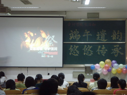 5月25日晚,由太阳成集团tyc151cc生活部举行的“端午遗韵,悠悠传承”活动在3217教室圆满举行。活动一开始,由主持人请上并介绍了缝制香囊的同学,当她们在缝制的时候,由云水涧民舞协会的同学献上了优雅的民族舞。随后播放了一段关于端午节的视频,主要介绍了端午的起源、风俗以及影响。之后,根据视频内容进行了提问,同学们的回答也很积极,并且每位回答问题的同学均获得了粽子。在问答环节之后,由民乐协会的同学带来了琵琶独奏。听完动听的琵琶曲之后,一些在5月过生日的同学欢聚一堂,在前面摆放了生日蛋糕,一起庆祝生日并送上来祝福。庆祝生日后,相关人员向大家展示了刚刚缝制好的香囊。最后,本活动在一曲《屋顶》中结束。活动虽短,但我们大家一起迎接端午节是很有意义的。