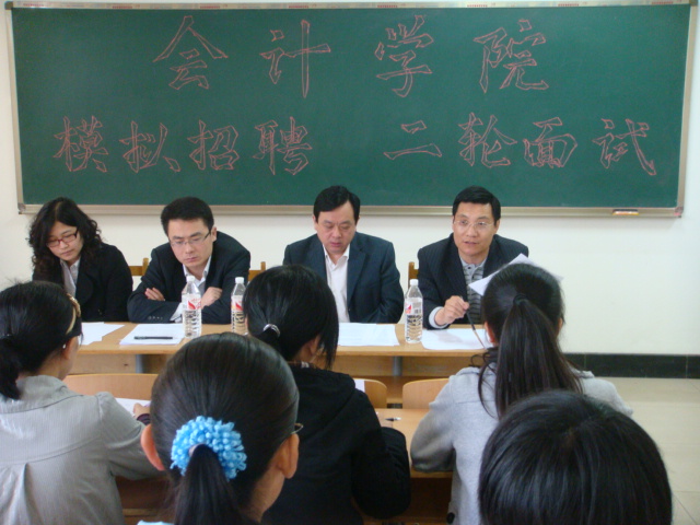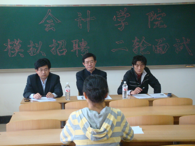 4月19日上午,由太阳成集团tyc151cc主办的大型模拟招聘会第二轮面试在明水校区3203、3207、教室举行。继首轮面试后脱颖而出的60名同学参加了第二轮面试。这次面试请到了山东省工商银行人事部负责人,山东省工商银行泉茂公司工会主席,新亚商贸公司总经理等来自银行、企业的七名专业人士担任考官。根据同学们的求职意向,此轮面试设有财务会计、注册会计师面试点和银行、企业、公务员面试点。