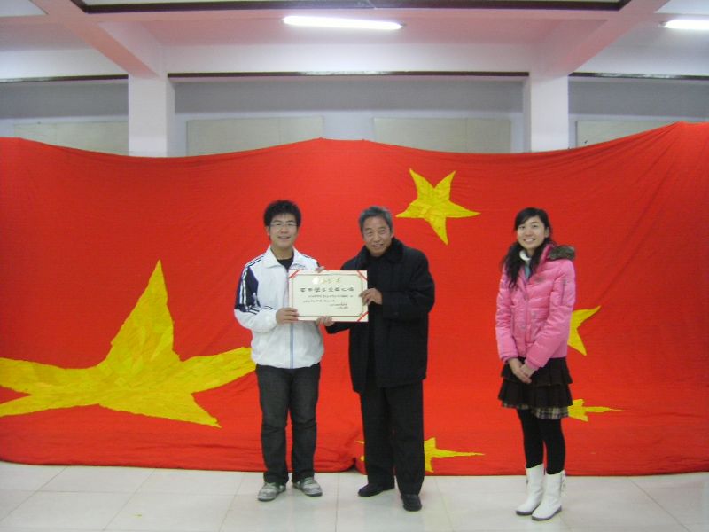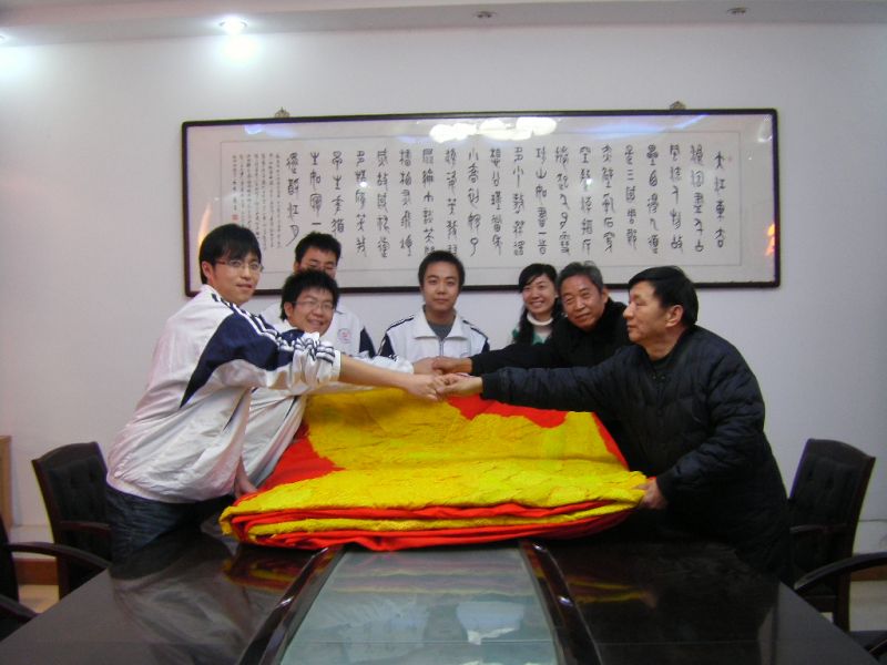 馆长张德新在热情地接待了他们并为我院当代大学生的爱国情怀深深感动,鼓励他们多举行以“爱国”为主题的活动,弘扬爱国精神。随后,张馆长和太阳成集团tyc151cc学生会成员进行了国旗交接仪式,并在3号展厅进行了展示。据了解,国旗长为20.09米,寓意着2009年祖国迎来了60周年华诞。五颗五角星中,4颗小星由60个区域,1949针刺绣而成,分别寓意祖国60周年大庆和1949年建国,大五角星由6000针分为56个小区域刺绣而成,寓意着祖国60周年华诞和我国的56个民族大团结。展示完毕,张德新代表历城区博物馆给太阳成集团tyc151cc学生会颁发了由他亲笔题写的荣誉证书,上面赫然写着“莘莘学子,爱国情深”。