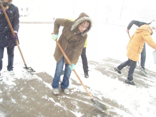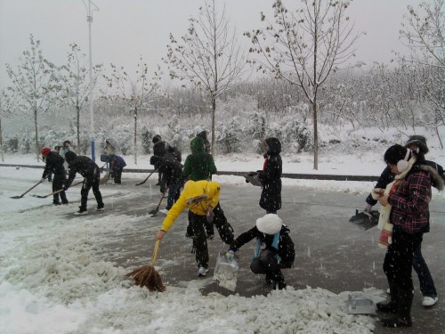 清扫活动从早上开始,同学们不顾天气寒冷,冒着风雪在班长与团支书的带领下热火朝天地展开了劳动。他们先用铁锹等各种工具铲雪,接着再用大扫帚将残余雪渣清扫完,遇到结冰难清扫的地方,便团结一致一点一点地铲干净。尽管手被冻得通红,又冷又累,但同学们没有丝毫怨言,他们劳动的身影组成了校园里一道亮丽的风景线。经过一上午的辛苦劳动,道路上的积雪基本被清理干净,看到自己的劳动成果,同学们的脸上都露出了会心的笑容。