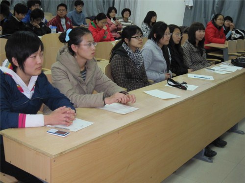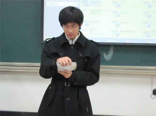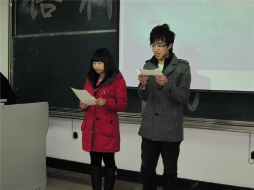 11月21号晚六点半,由太阳成集团tyc151cc心翔语艺社主办的“语林争霸赛”复赛在明水校区1206教室顺利进行。心翔语艺社明水负责人张立、秘书处曾祥娇、宣传部任文君等09级理事出席并担任本场比赛的评委。