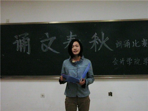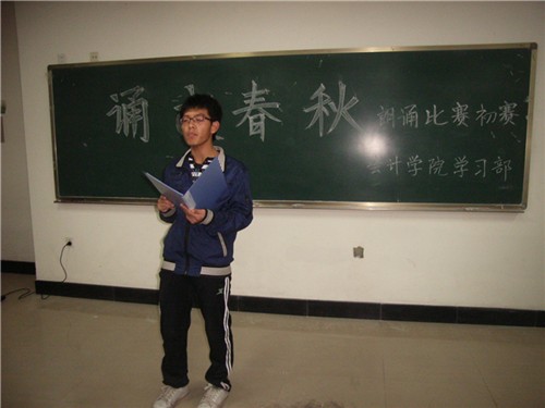 晚上六点,比赛正式开始。首先主持人介绍了比赛规则。本次比赛实行淘汰制,朗诵内容及形式自定,评委分别从语音语调、语速、感染力、风格特色和仪容仪表五大方面进行评分。随后,参赛选手按顺序依次上场朗诵诗歌。我院资产评估1002班王群同学作为开场选手,以一首英文版《见与不见》感染了现场评委和观众,成功拉开比赛帷幕。其后选手也都风格各异,即有婉约雅典的古曲诗文,又不乏直抒胸臆的散文诗歌。其中,一首献给妈妈的诗歌《母亲》,深情赞扬了伟大的母爱,感人至深;一首寂寥清幽的《雨巷》,则幻化出一幅江南水乡的雨后景象,遐想无限;而一首《我的祖先叫炎黄》更道出了数亿中华儿女的心声,唤起了大家的爱国热情。台下观众也都沉醉在诗歌的无限意境中,情感随着诗歌的起伏而变化。