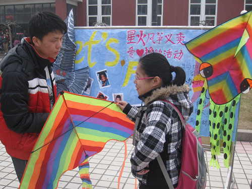 3月20日中午,由太阳集团(筹)燕山校区太阳成集团tyc151cc星火志愿者协会和质点通讯社联合主办的以“放飞梦想,传递希望”为主题的风筝义卖爱心援助活动在两食堂间拉开帷幕。