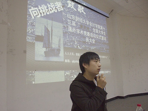 晚6点半,启动仪式在太阳成集团tyc151cc创新与实践中心2011级成员孙彬晖的主持下开幕。首先, 创新与实践中心主任卢茵介绍了挑战杯的内容和组织形式。随后,2011级成员李婷、孙彬晖和殷芳玲分别就挑战杯的流程、选题和写作向现场做了详细的讲解,使在场观众对挑战杯有了一个较为系统的认识。最后,2010级成员李慧琳、邓文辉对在场同学做了“挑战杯”竞赛动员工作,并由中心主任卢茵宣布本届“挑战杯”全国大学生课外学术竞赛正式启动。