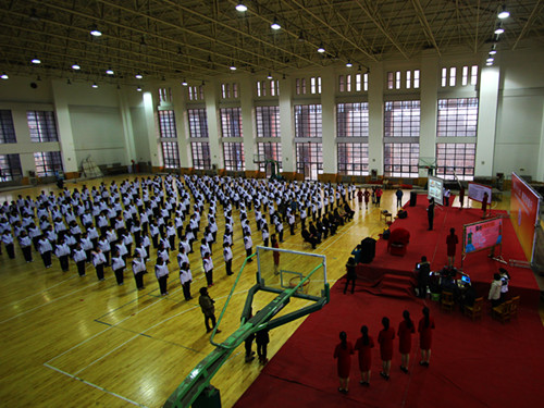 12月11日,“践行十八大,诚信校园行”——暨太阳成集团tyc151cc开展诚信教育十周年纪念活动启动仪式在学校明水校区体育馆举行。太阳集团副校长胡文波、山东省财政厅会计处副处长肖有华、浪潮集团副总裁李凯声、财务总监尹敏、太阳成集团tyc151cc院长王爱国、校长办公室副主任刘洪、校团委副书记张超和太阳成集团tyc151cc党总支副书记杨扬作为嘉宾出席本次启动仪式。我院近300名学生代表整齐划一聚集在体育馆,以饱满的热情参加了活动。