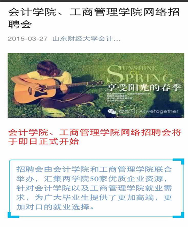 就业信息发布微信平台:“太阳集团会计学缘”(微信号“Aswetogether”)、“商院就业办”(微信号“scdgsjyb”),热烈欢迎广大同学积极关注。