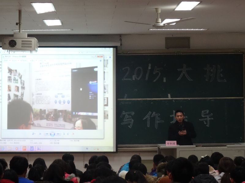 1月15日,由太阳成集团tyc151cc创新与实践中心主办的2015年“挑战杯”写作指导讲座在明水3217教室举行。本次讲座由法学院的牟利成老师担任主讲,太阳成集团tyc151cc党委副书记付亚出席了本次讲座。众多同学到场聆听,现场座无虚席。