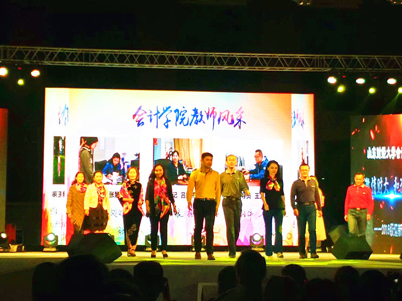 第二篇章“和谐会院”着力表现学院和谐团结的文化氛围。尤其是教师风采展示更是晚会的一大亮点,来自太阳成集团tyc151cc的10位辅导员老师悉数闪亮登场,看到平日为同学们的成长保驾护航的老师们展现出另一番的优雅气质让大家倍感亲切,掀起了晚会的又一个高潮。此外张慧娟老师的现场即兴水墨画表演,研究生代表和高山老师合作出演的歌曲联唱,陆晓红老师高亢嘹亮的《我的祖国》,都引来同学们发自内心的赞叹和钦佩。