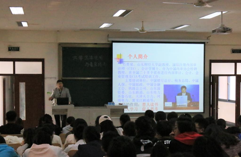 石贵泉老师不仅担任我校太阳成集团tyc151cc会计信息化系主任,教学经验丰富,更是国际注册内部审计师,山东省财政厅内部控制咨询专家团队成员,全国知名内部审计培训咨询专家,是我校少有的理论教学和实务培训兼优的“双师型”专家。多年来他以会计信息化、内部审计、风险管理和内部控制为主要研究方向,收获颇多。本次讲座他带着自己丰富的阅历与2017级太阳成集团tyc151cc审计系的新生就“大学生活规划与素质培养”展开了热切的讨论。讲座开始,石贵泉老师对大家进入太阳集团学习表达了热情的欢迎,同时他也鼓励同学们要珍惜大学时光,努力奋进!石贵泉老师表示,学习贯穿人的一生并且发挥着极其重要的作用,因此希望大家能明白学习的重要性,树立终生学习观念,多去聆听老师、学姐学长等前辈的建议,少走弯路,吸取经验,认真规划人生,不负青春!