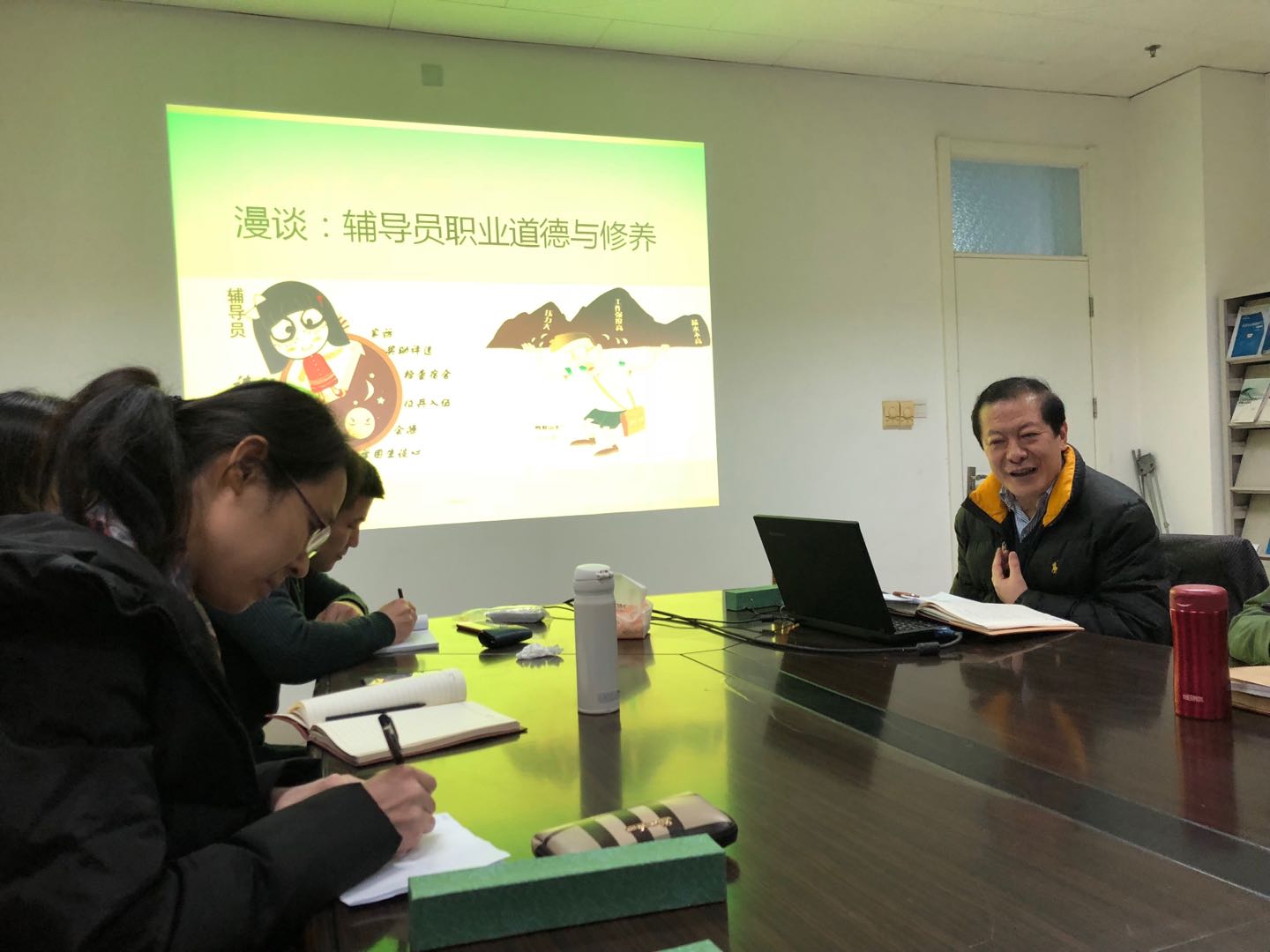 随后学院党委副书记崔东峰向全体辅导员传达了学校关于2018年学生工作的主要精神和工作要点,提出要狠抓学风建设,进一步做好学生心理健康教育服务工作,加强就业指导工作,做好共青团改革和“三千计划”以及积极推动校友工作开展等,树立学生工作要助力学生成长、成才,加强学生理想主义教育,培养学生具备健康的身心和一定的文体特长,做好学生服务、引导和管理的学生工作理念。此外崔书记还布置了学院近期的一些相关工作。