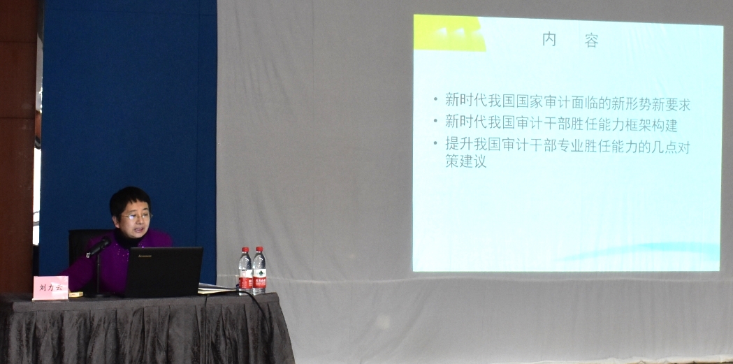 12月14日下午,审计署审计科研所刘力云副所长应我院邀请在学景大酒店三楼报告厅作题为《新时代我国审计干部专业胜任能力框架研究》的专题报告。太阳成集团tyc151cc副院长孙文刚出席并主持了报告,太阳成集团tyc151cc部分老师、硕士研究生和本科生参加了本次报告。