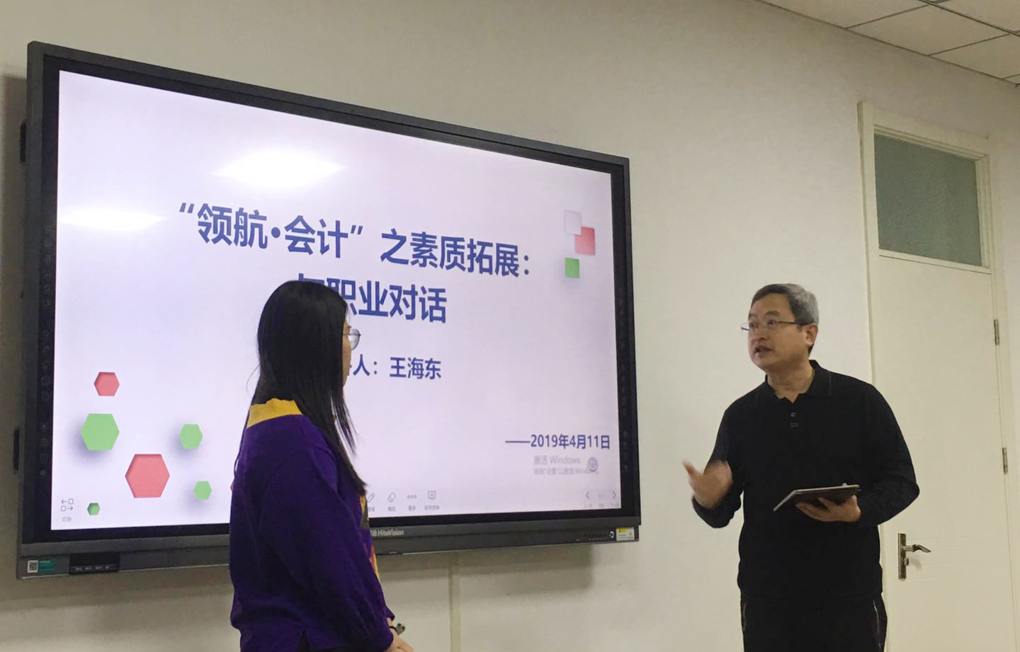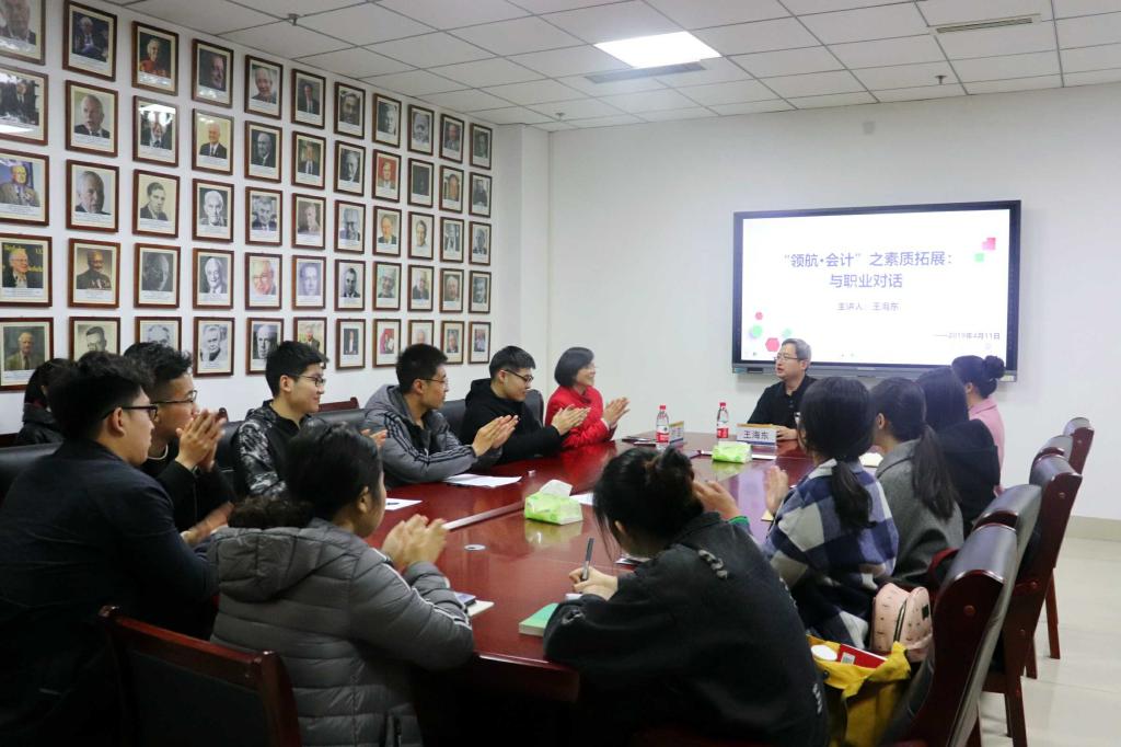4月11日下午,我校优秀校友王海东应太阳成集团tyc151cc邀请来到燕山校区,在逸夫楼309进行“领航•会计”交流会,太阳成集团tyc151cc党委副书记付亚、辅导员张慧娟出席。交流会由付亚主持。
