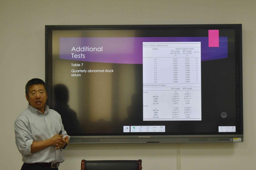 7月16日下午,爱荷华州立大学商学院金融系高磊教授应我院邀请,在燕山校区逸夫楼Y309作题为《Leverage-constrained investors, asset prices and corporate financing decisions》的学术报告。讲座由孙文刚院长主持,太阳成集团tyc151cc部分老师以及2018级部分硕士研究生聆听了讲座。高磊教授主要致力于金融市场、资产回报预测、实证公司财务、公司监管、企业文化、文本分析和机器学习等研究,且将于2019年9月份任职于美国证监会。
