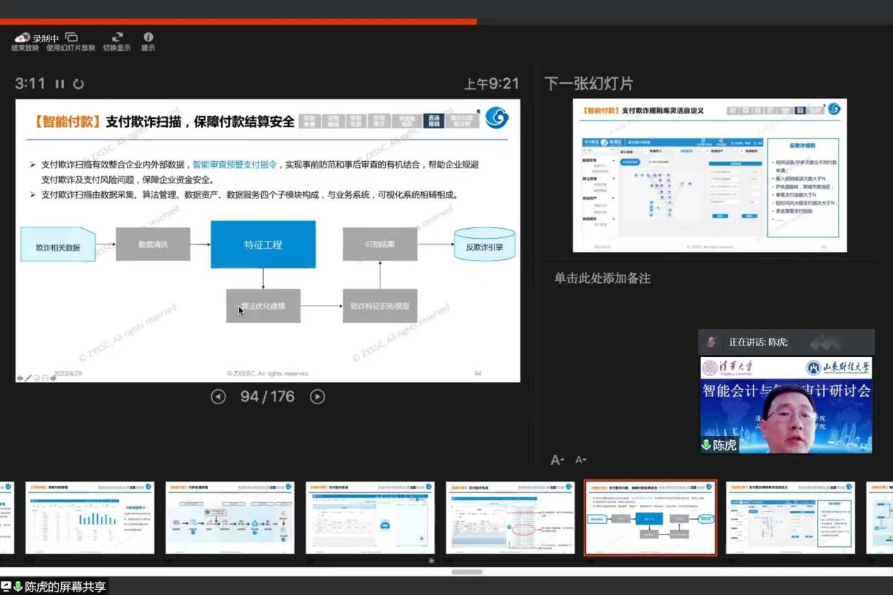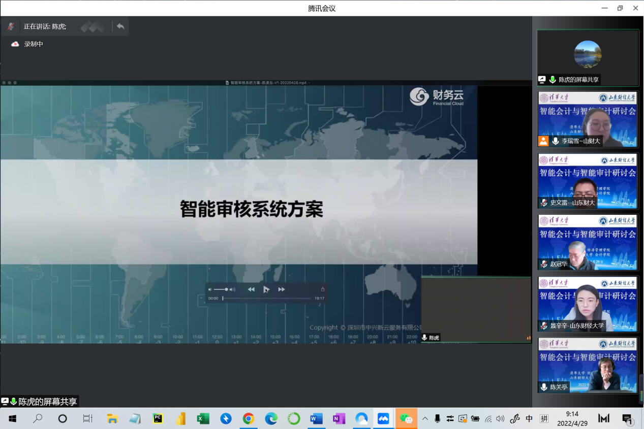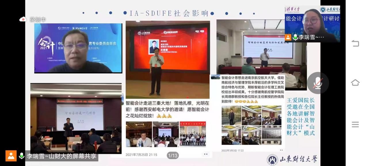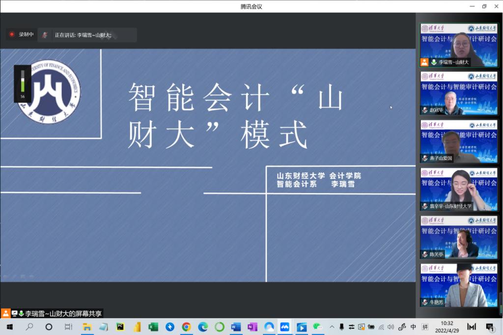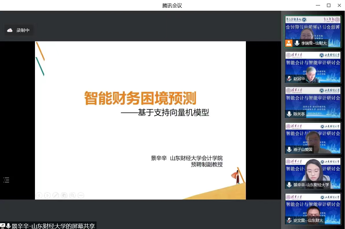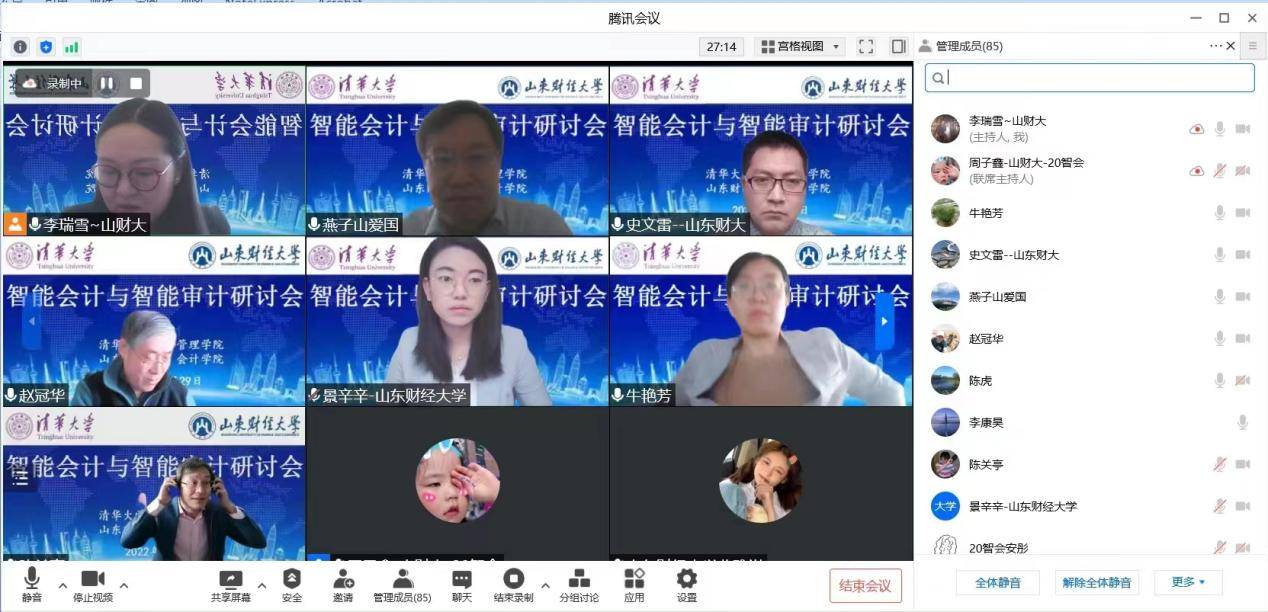 2022年4月29日,由太阳集团、清华大学共同举办的智能会计(审计)研讨会在线上顺利举行。清华大学陈关亭教授团队(清华大学博士后、中兴新云服务有限公司总裁陈虎、清华大学张学工教授、中央民族大学黄小琳教授等)、太阳集团王爱国教授团队(赵冠华、牛艳芳、石贵泉、史文雷、李瑞雪、景辛辛、王春燕、李康昊等诸位教授博士)及智能会计班部分学生共125人参加研讨会。本次会议由李瑞雪主持。
