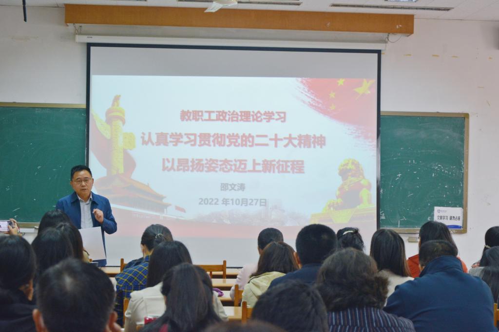 会议首先进行了政治理论学习,邵文涛传达了习近平总书记在二十大上代表十九届中央委员会所作的工作报告要点。邵文涛强调,全体教职工要把学习贯彻党的二十大精神作为当前和今后一个时期的首要政治任务,深刻领悟“两个确立”的决定性意义,增强“四个意识”、坚定“四个自信”、做到“两个维护”,迅速把思想和行动统一到党的二十大精神上来,把对党的二十大精神的政治认同、思想认同、情感认同转化为推动学校、学院事业发展的强大动力,确保党的二十大精神在学院落地生根,开花结果。