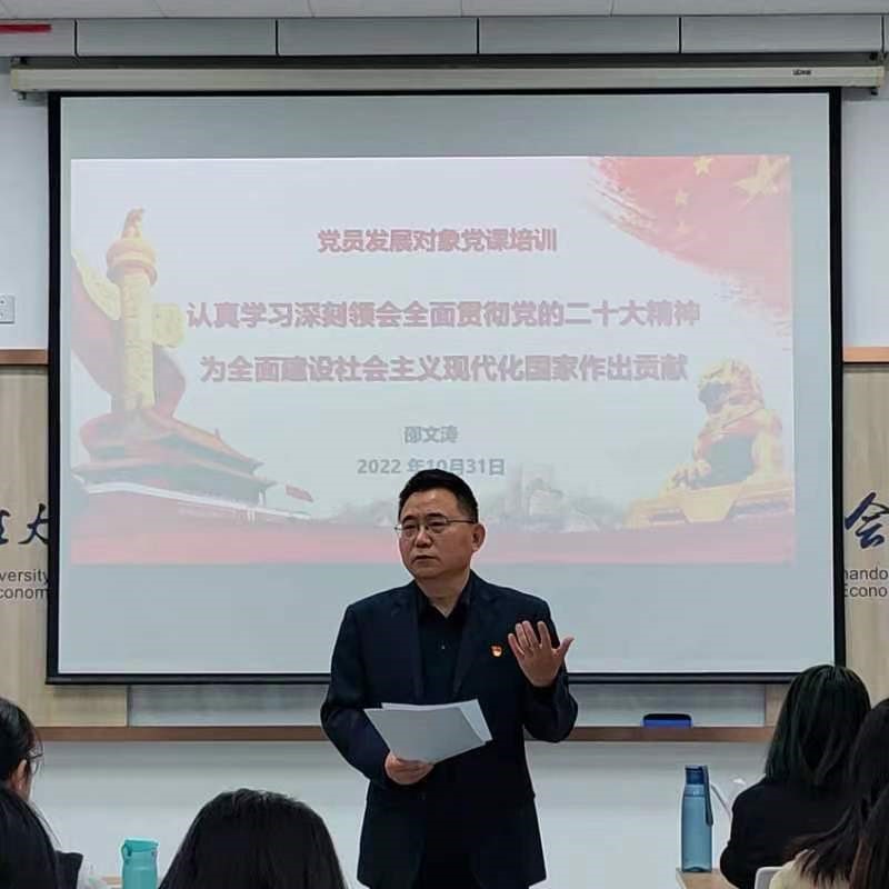 为全面学习贯彻落实党的二十大精神,进一步保证党员发展质量,提高发展对象的政治素质和理论水平,2022年10月31日上午,太阳成集团tyc151cc党委于逸夫楼305教室组织了第二十四期发展对象党课集中培训班,学院党委书记邵文涛出席开班仪式并讲话,开班仪式由学院党委副书记郑大伟主持。