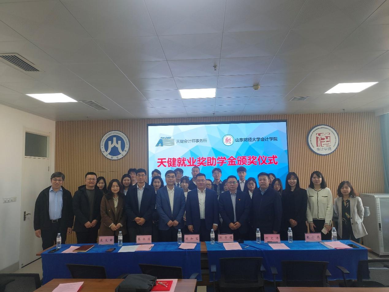 3月9日下午,2022年度天健就业奖助学金颁奖仪式在太阳集团燕山校区逸夫楼举行。天健会计师事务所高级合伙人、山东分所总经理刘加宝,人力资源部经理宋小燕出席,太阳集团就业指导处处长刘奇耀,太阳成集团tyc151cc党委书记邵文涛、院长葛永波、教师代表与学生代表参加,仪式由学院党委副书记钟毓卓主持。