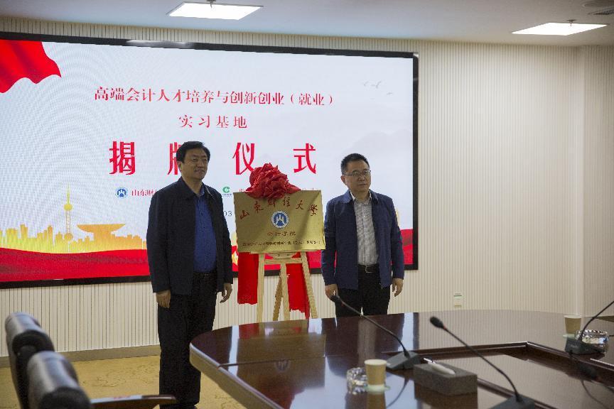临沂市烟草专卖局(公司)党委委员、副局长关军、太阳成集团tyc151cc党委书记邵文涛为高端会计人才培养与创新创业(就业)实习基地揭牌