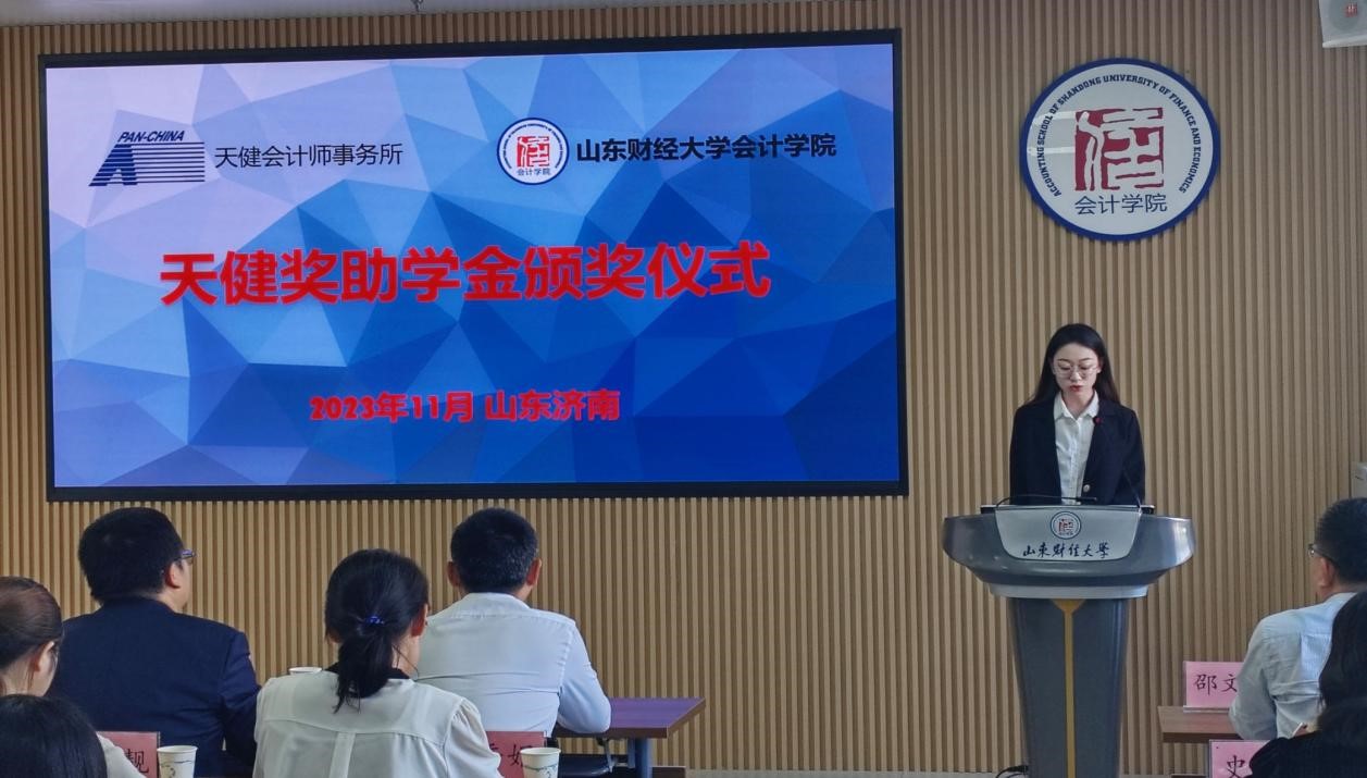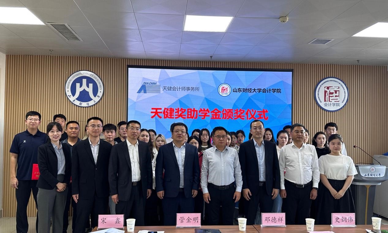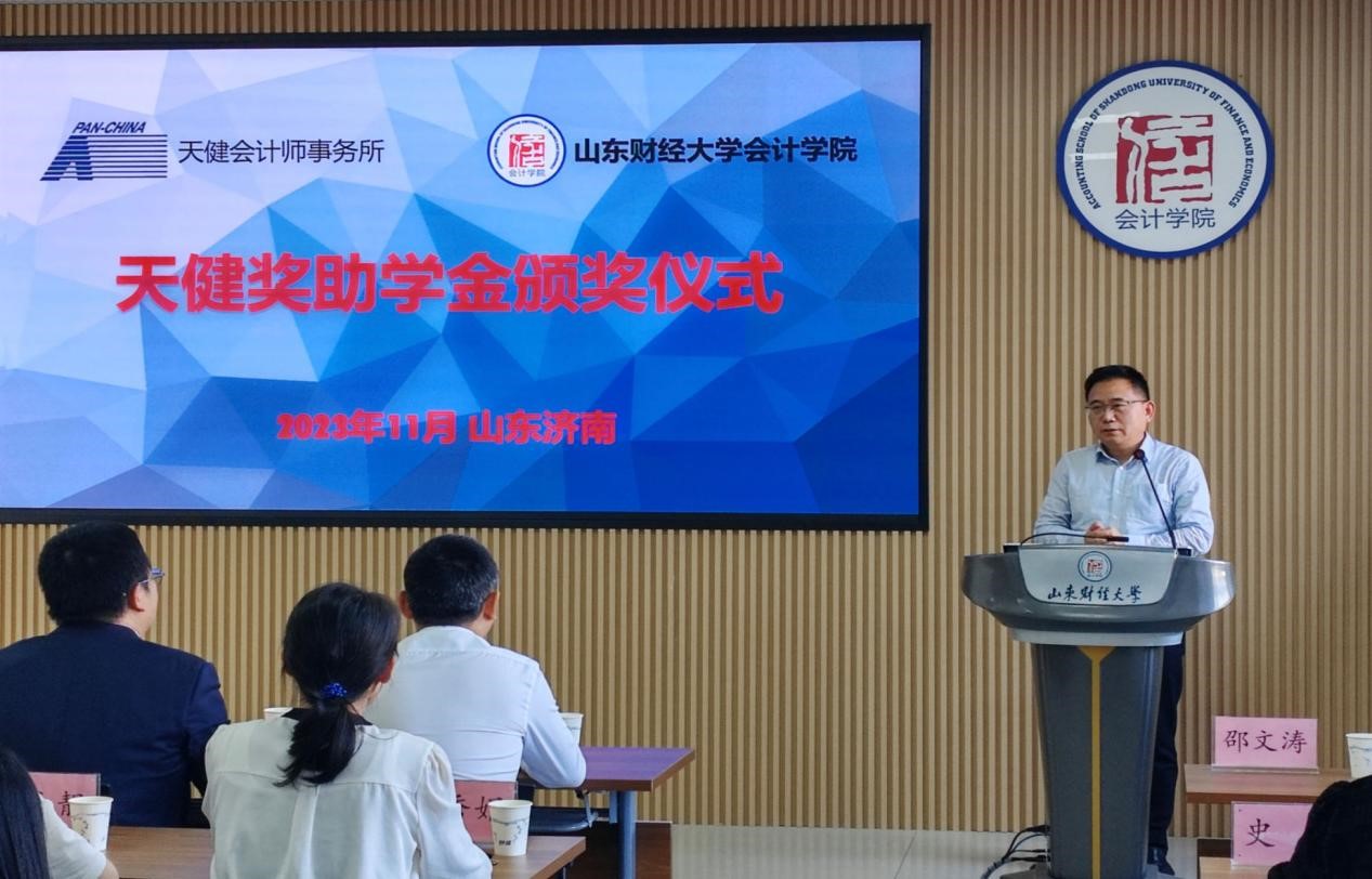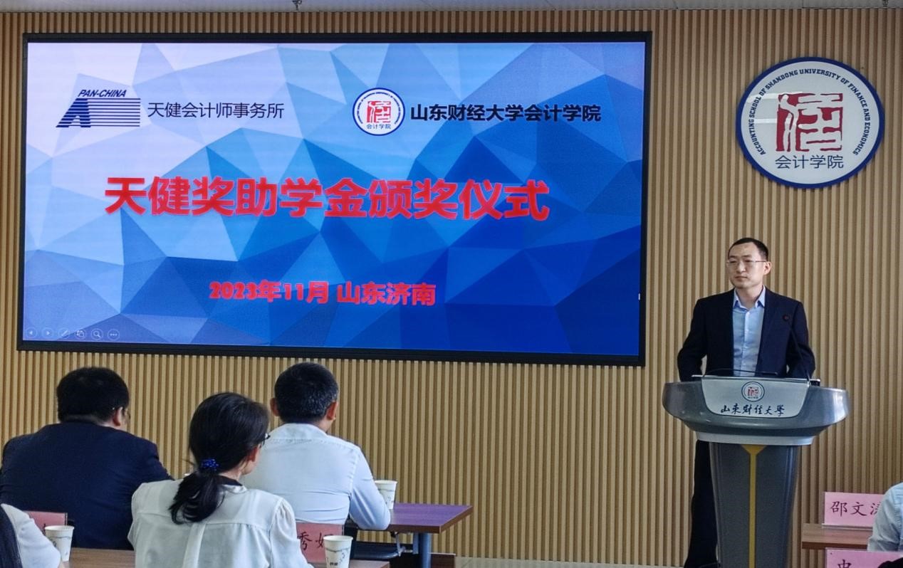 11月1日下午,2023年度天健就业奖助学金颁奖仪式在太阳集团燕山校区逸夫楼举行。天健会计师事务所高级合伙人、山东分所副总经理管金明,高级合伙人、主任会计师助理邓德祥,合伙人宋鑫,合伙人、山东分所总经理助理史钢伟,人力资源总部高级经理韩杰,人力资源总部助理经理林小靓,山东分所人力资源部经理宋小燕,太阳成集团tyc151cc党委书记邵文涛以及教师代表、学生代表参加,仪式由辅导员史岩主持。