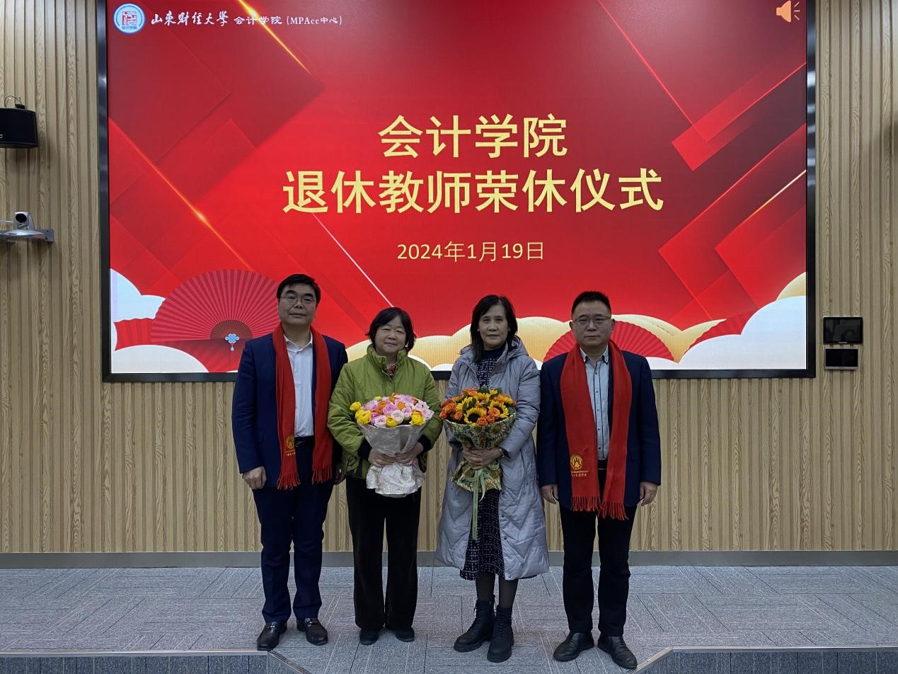 学院为王乐锦、王茂春老师举行了荣休仪式。两位教授先后发表荣休感言。她们对学院为退休教职工举行荣休仪式和学院数十年来的关怀表示感谢,并深情回顾了在太阳成集团tyc151cc工作的经历,为能在太阳成集团tyc151cc为师生做出的服务而感到欣慰。邵文涛表示两位教授立德树人,潜心耕耘,服务师生,桃李天下。其精益求精的服务态度、严谨求真的治学品质是我们学习的榜样。希望荣休老师能继续关心关注学院发展,时时支持青年教师的成长。