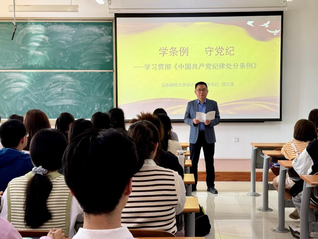 为深入学习贯彻习近平总书记关于党纪学习教育的重要讲话、重要指示精神,学习贯彻党中央决策部署和省委工作要求,不断增强学生党员的责任感、使命感和担当意识,4月25日下午,太阳成集团tyc151cc党委书记邵文涛在圣井校区为学生党员讲授“学条例 守党纪”——党纪学习教育专题党课。学院党委副书记钟毓卓,党委组织员、学生第二党支部书记张沫以及圣井校区学生党员参加。