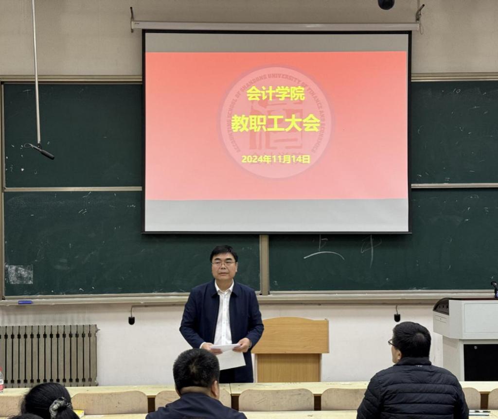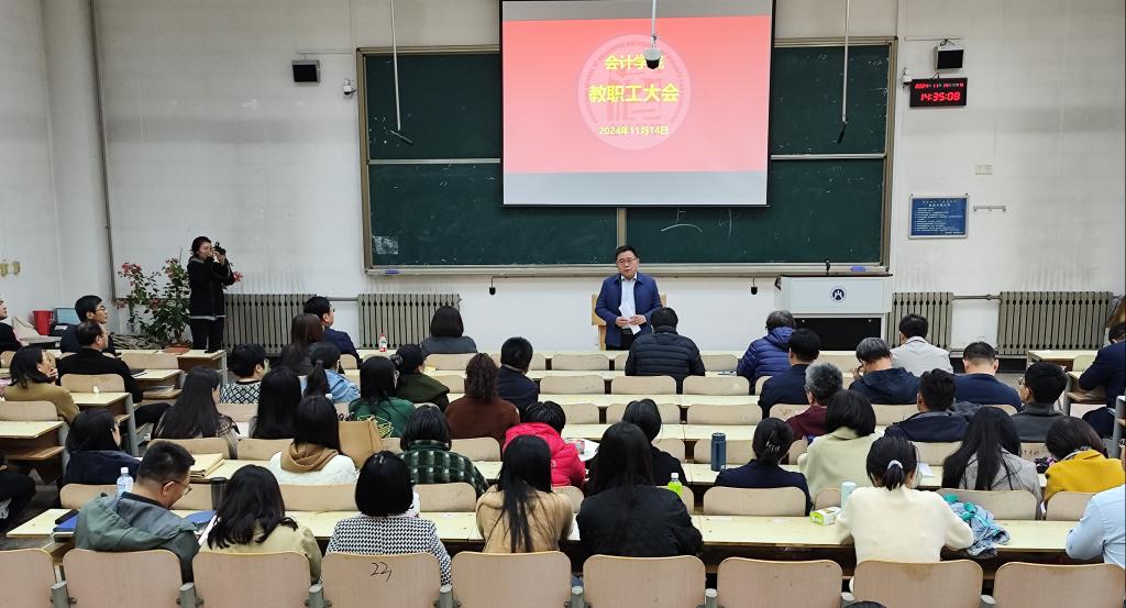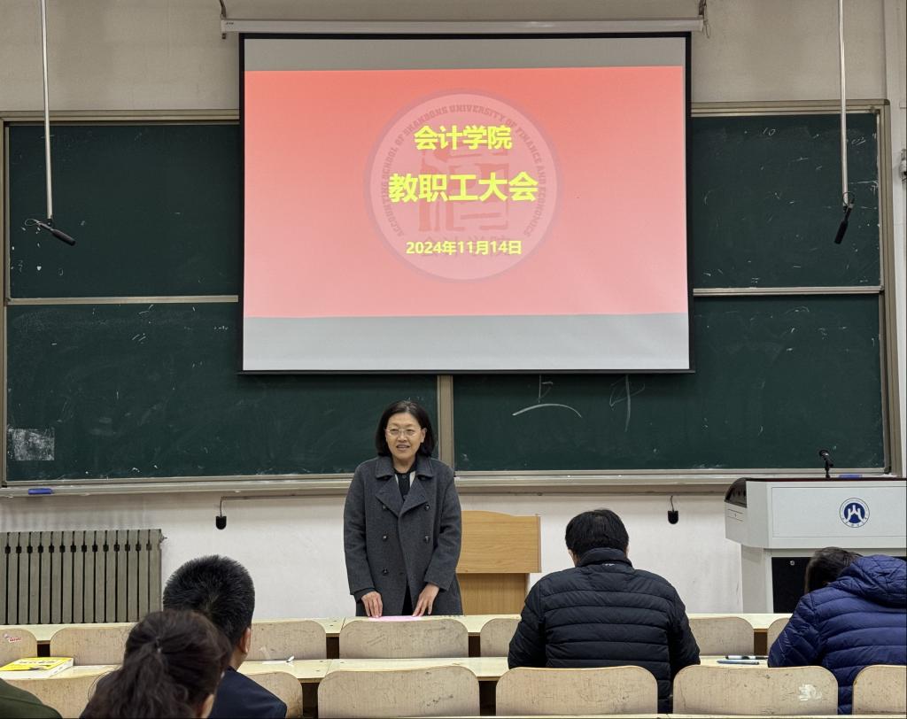 张红霞与全体教职工进行了深度交流,她肯定了太阳成集团tyc151cc的辉煌成绩及全体教职工的辛勤付出,并对太阳成集团tyc151cc的发展提出要求,她首先强调了师德师风建设的重要性,指出要进一步强化政治理论学习,提升政治素养和业务能力。其次,在教研科研方面,张红霞向全体教职工分享了自身教学心得与经验,指出要大力弘扬教育家精神,加强教研科研建设,传承并发扬“红色会计”,发展智能会计。最后,张红霞呼吁全体教职工再接再厉,为学校建成全国一流财经特色名校共同努力。