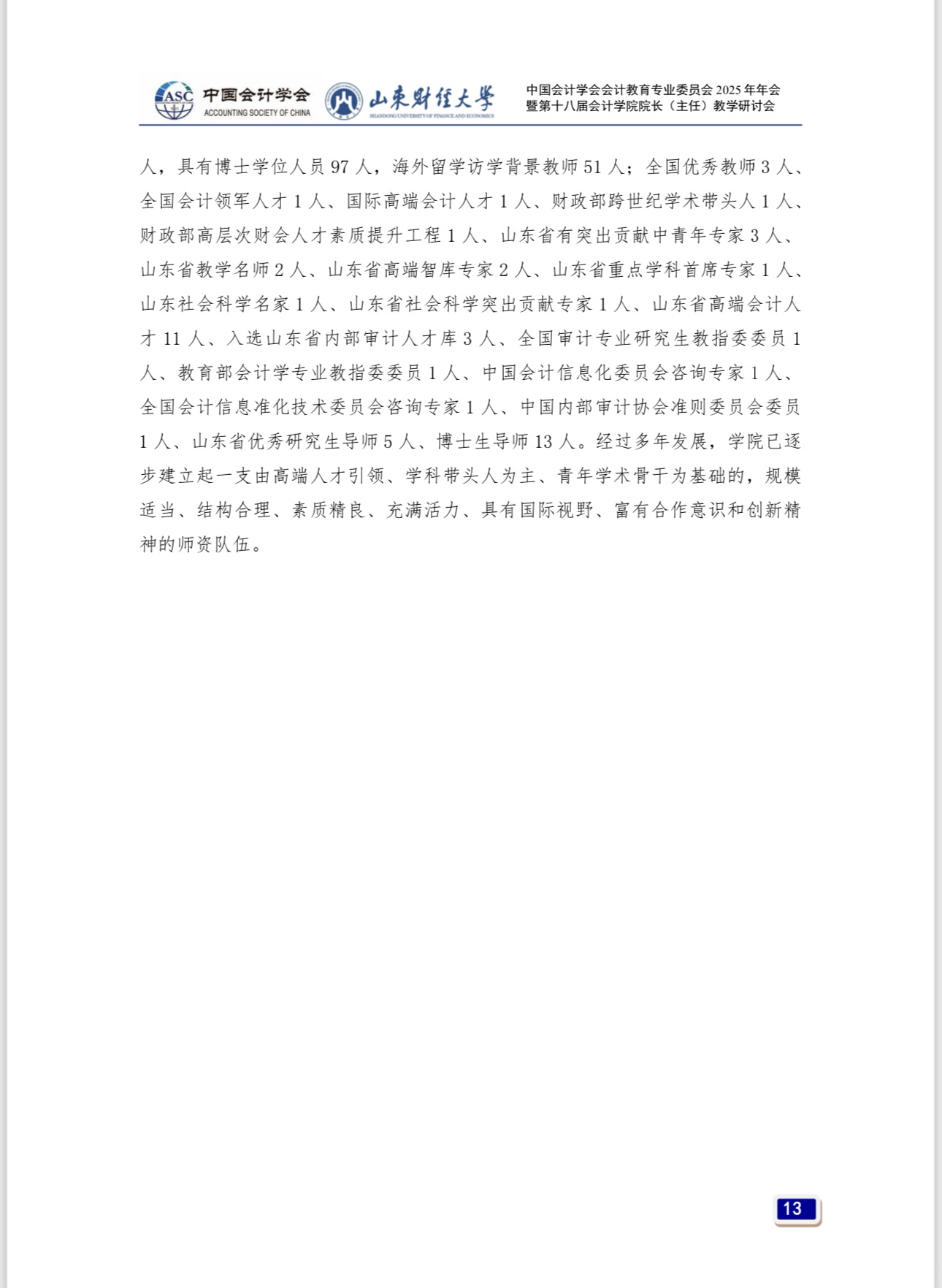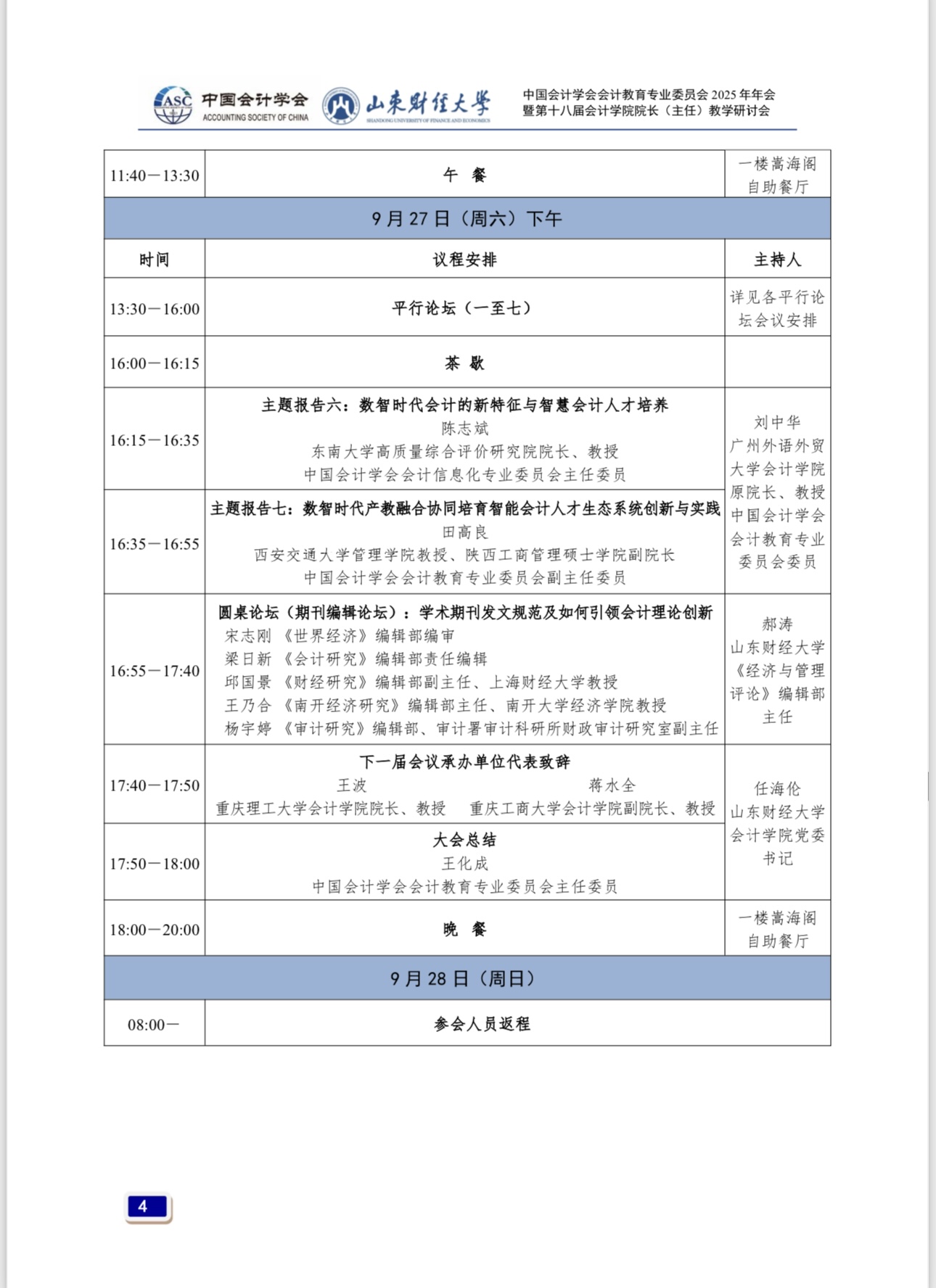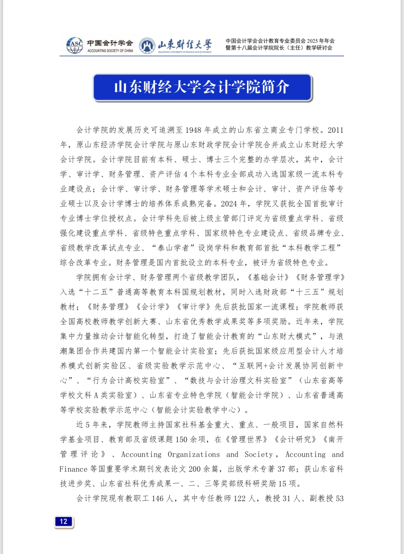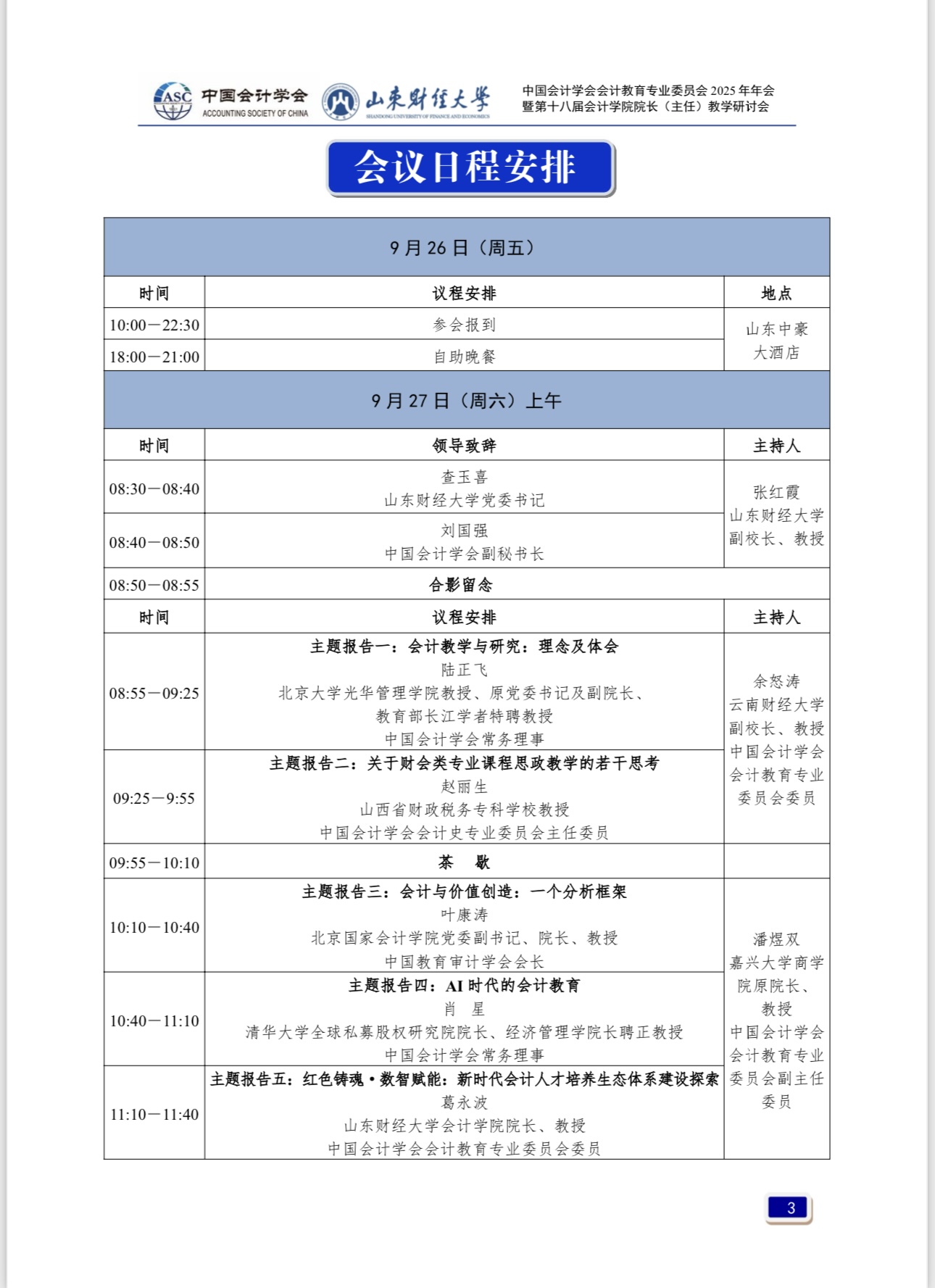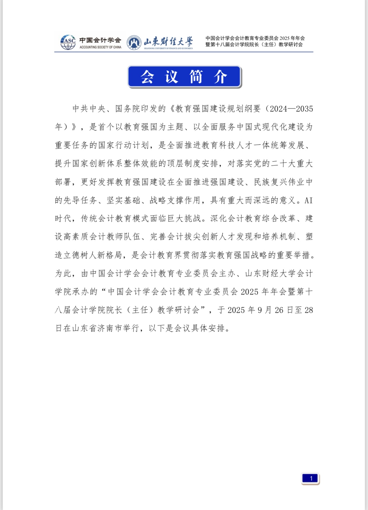 中共中央、国务院印发的《教育强国建设规划纲要(2024—2035 年)》,是首个以教育强国为主题、以全面服务中国式现代化建设为重要任务的国家行动计划,是全面推进教育科技人才一体统筹发展、提升国家创新体系整体效能的顶层制度安排,对落实党的二十大重大部署,更好发挥教育强国建设在全面推进强国建设、民族复兴伟业中的先导任务、坚实基础、战略支撑作用,具有重大而深远的意义。AI时代,传统会计教育模式面临巨大挑战。深化会计教育综合改革、建设高素质会计教师队伍、完善会计拔尖创新人才发现和培养机制、塑造立德树人新格局,是会计教育界贯彻落实教育强国战略的重要举措。为此,由中国会计学会会计教育专业委员会主办、太阳成集团tyc151cc承办的“中国会计学会会计教育专业委员会2025年年会暨第十八届太阳成集团tyc151cc院长(主任)教学研讨会”,于2025年9月26日至28日在山东省济南市举行,以下是会议具体安排。