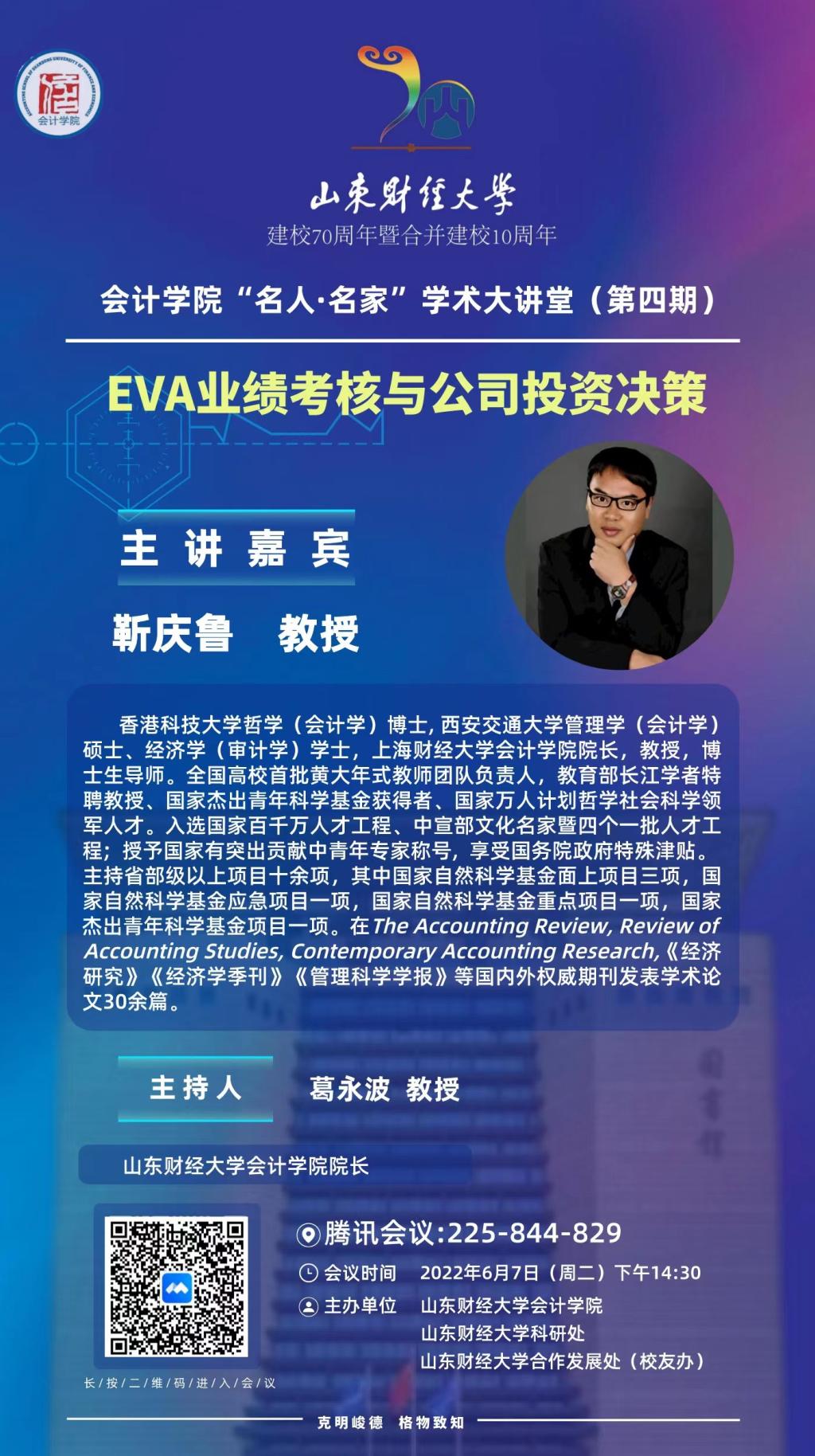 第四期“名人·名家”学术大讲堂将由上海财经大学太阳成集团tyc151cc院长靳庆鲁主讲,主题为:EVA业绩考核与公司投资决策。