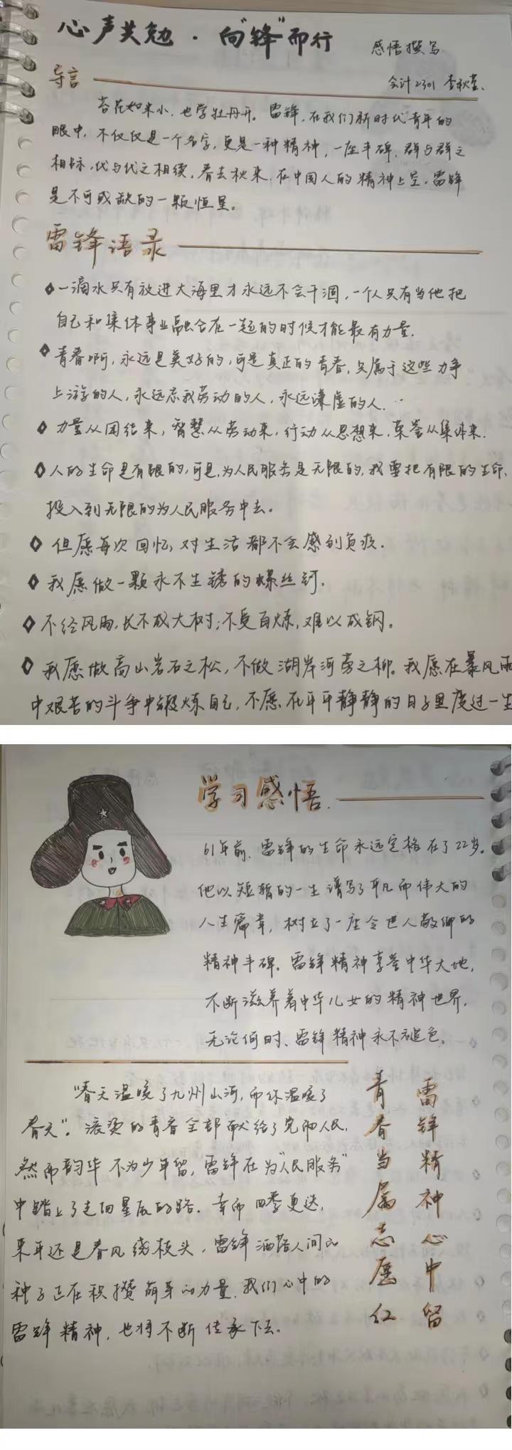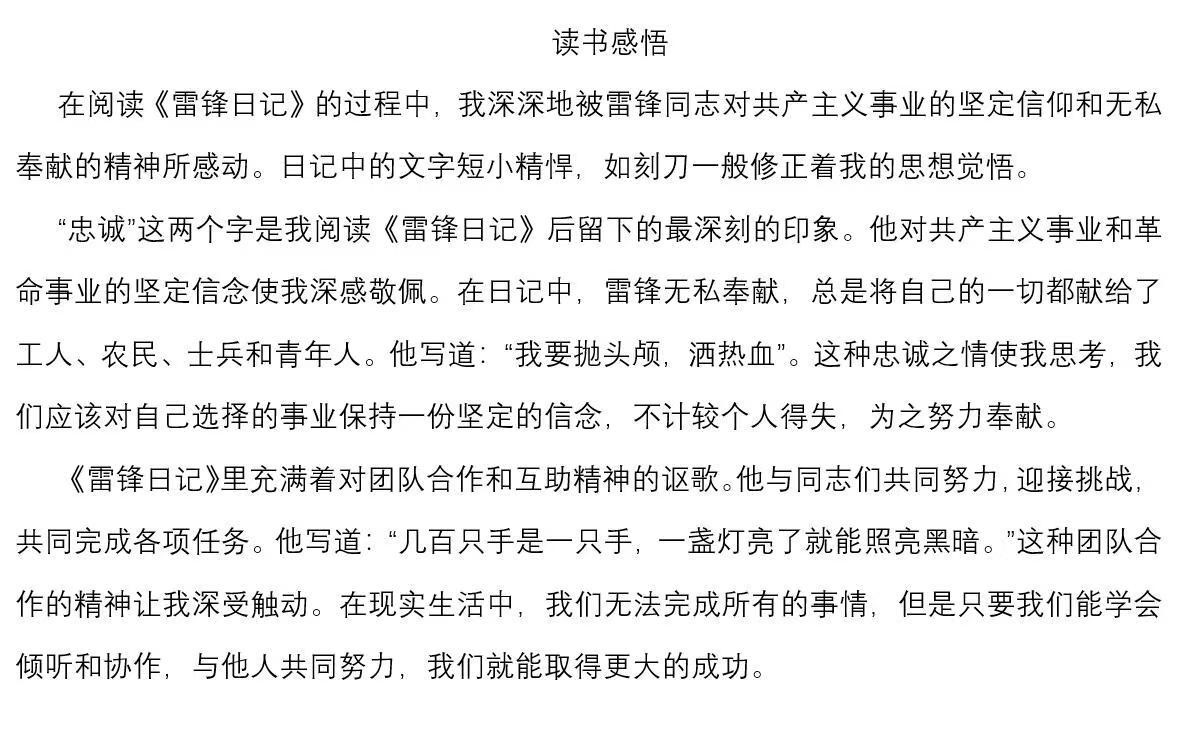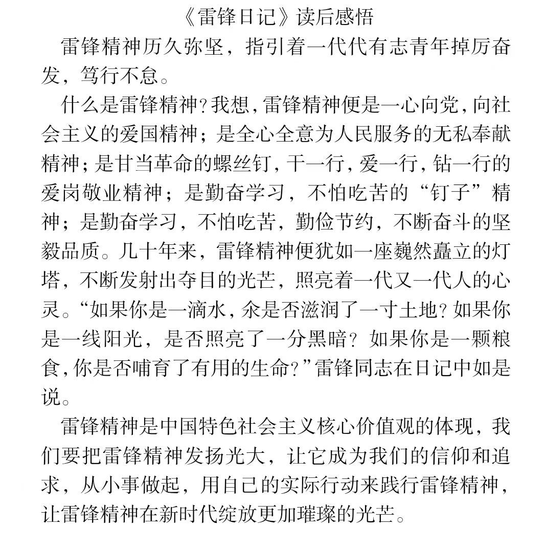 春风拂面,雷锋精神暖人心。六十年来,雷锋精神代代赓续传承,持续滋养着千千万万个我们,历久弥坚。为强化同学们对雷锋精神的认识,倡导无私奉献、乐于助人的社会风尚,太阳成集团tyc151cc特举办“心声共勉 向‘锋’而行”感悟撰写活动。在此次感悟撰写活动中,同学们积极参与,认真阅读《雷锋日记》、雷锋传记或观看相关纪录片,更直观、深入地感悟到雷锋同志乐于助人、甘愿为人民服务的伟大精神,用细腻的文字,精美的照片表达了对雷锋精神的赞美和敬佩,创作出许多内容充实,感情真挚的作品。经过认真评选,许多同学的作品被遴选为优秀作品。其中部分优秀作品如下: