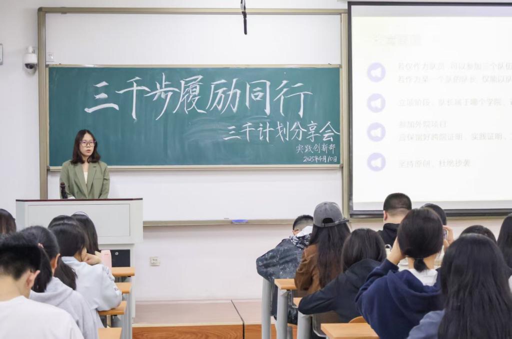 实践创新部王雅臻介绍了“三千计划”的概况、流程、意义及注意事项,阐述了其对学生成长与成果转化的积极作用。