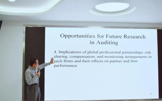 随后,张教授讲解了关于未来管理会计和审计的一些研究方向。在管理会计领域可能有如下研究方向:客户盈利能力分析是否影响客户关系管理实践、新管理制度对绩效的影响、绩效薪酬与基准等等。在审计领域可能有如下研究方向:审计质量、审计费用、审计独立性、盈余管理和公司治理等等。张教授提醒同学们要格外关注因果研究、变量选择、外部有效性和统计有效性等方面。