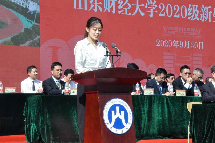 公共管理学院2017级劳动与社会保障专业庄晨、新生代表国际经贸学院2020级国际经济与贸易类王番作为在校生代表发言。