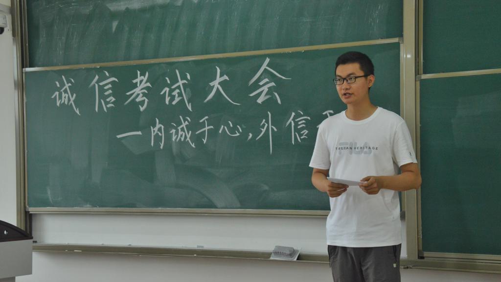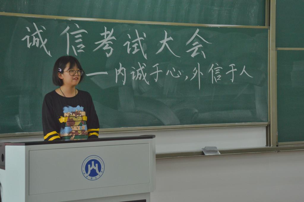 随后,学生代表王子怡向同学们分享了自己的感触。她指出,考试过程中看似复杂的各项规定其实都是在要求我们做一个诚信的人,不要为了相对漂亮的成绩或一时的荣誉在人生的回忆中留下污点,同学们要互勉共进,自觉遵守考试纪律和有关规定,弘扬求实学风,坚决杜绝作弊行为,让诚信留守校园。大会在同学们的宣誓中圆满结束。